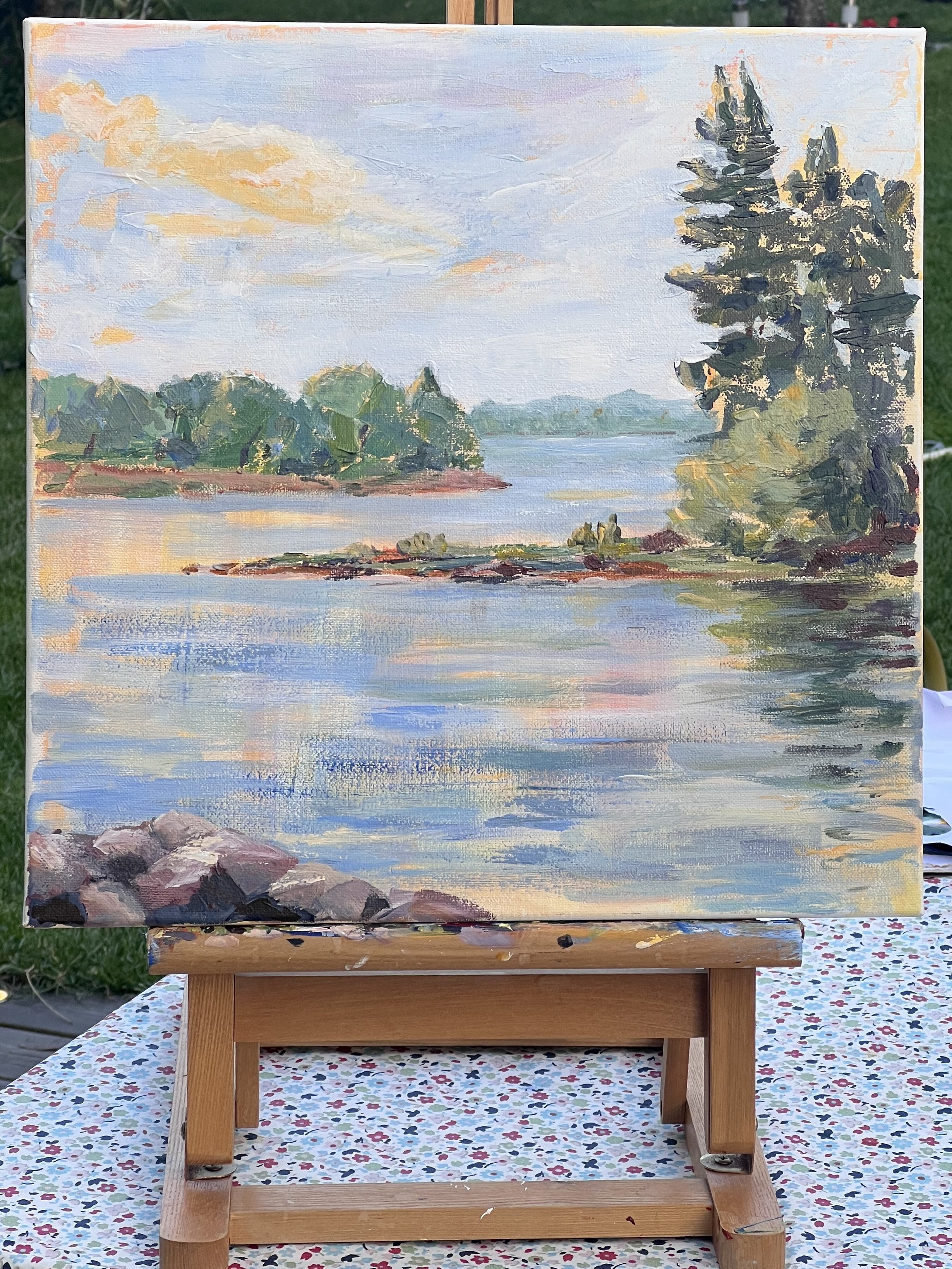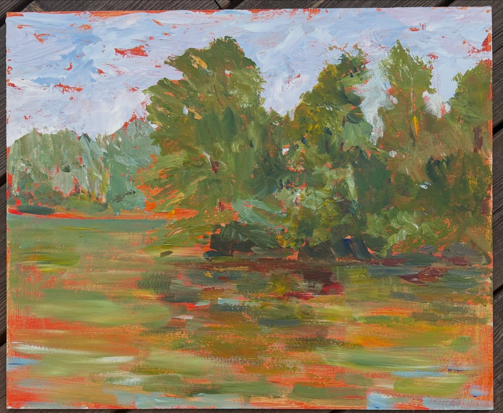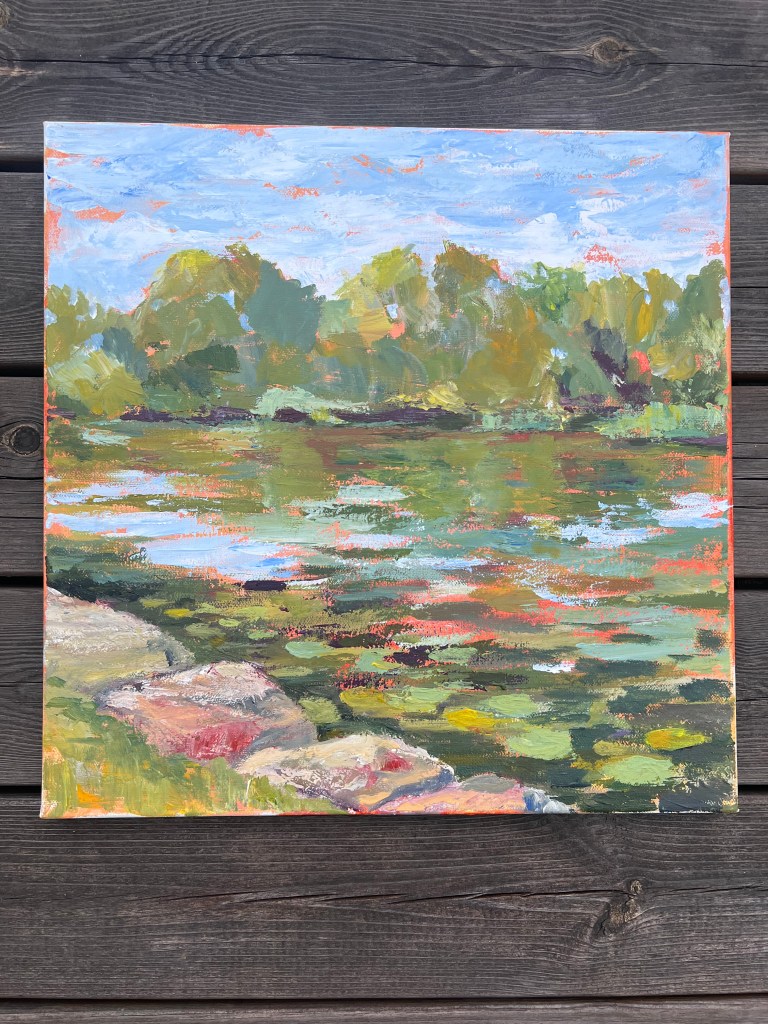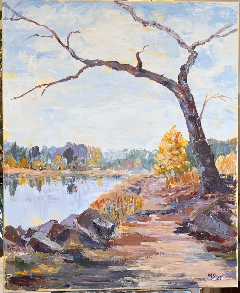 Acrylic painting capturing the interplay of light and color in a serene landscape with trees and water. 2025